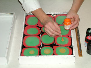 | Aufbringen der Farbe | Stäbchenzug | Kammzug | Auflegen des Papiers |