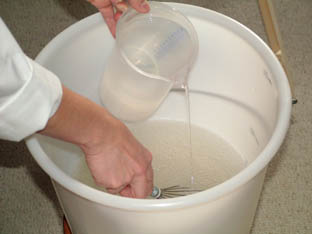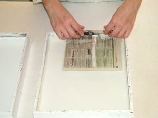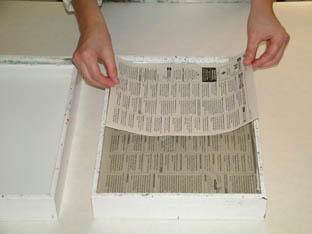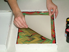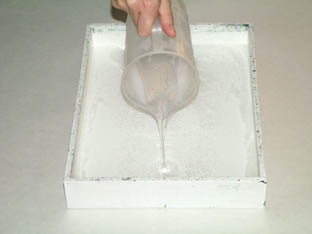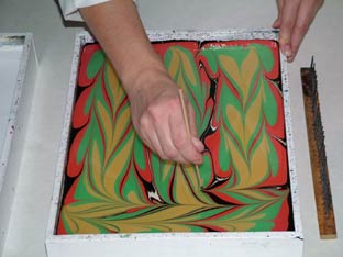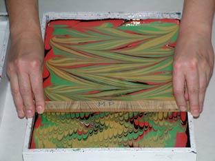 | Vorbereiten des Kleisters | Befüllen der Marmorierwanne | Abdecken des Marmoriergrundes | Entfernen des Abdeckpapiers |